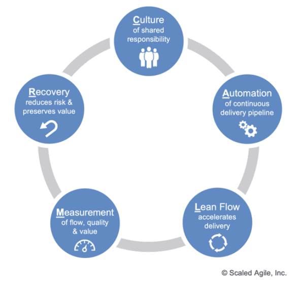 Culture. In SAFe, DevOps leverages the culture created by adopting the Lean-Agile values, principles, and practices of the entire Framework. Nearly every principle of SAFe, from Principle #1, take an economic view, to Principle #10, organize around value, applies to DevOps. DevOps enables shifting some operating responsibilities upstream, while following development work downstream into deployment, and operating and monitoring the solution in production.