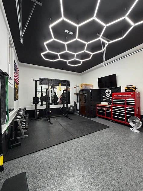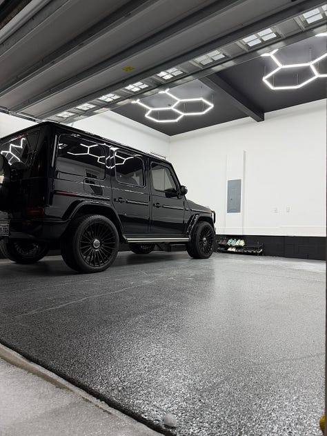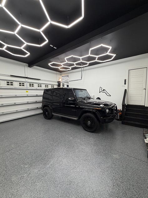I had the ceilings painted black by Mathias Painting, and Hexglow lights installed by Jado Customz. Everything looks better than I anticipated. The garage has turned into such a cool space.