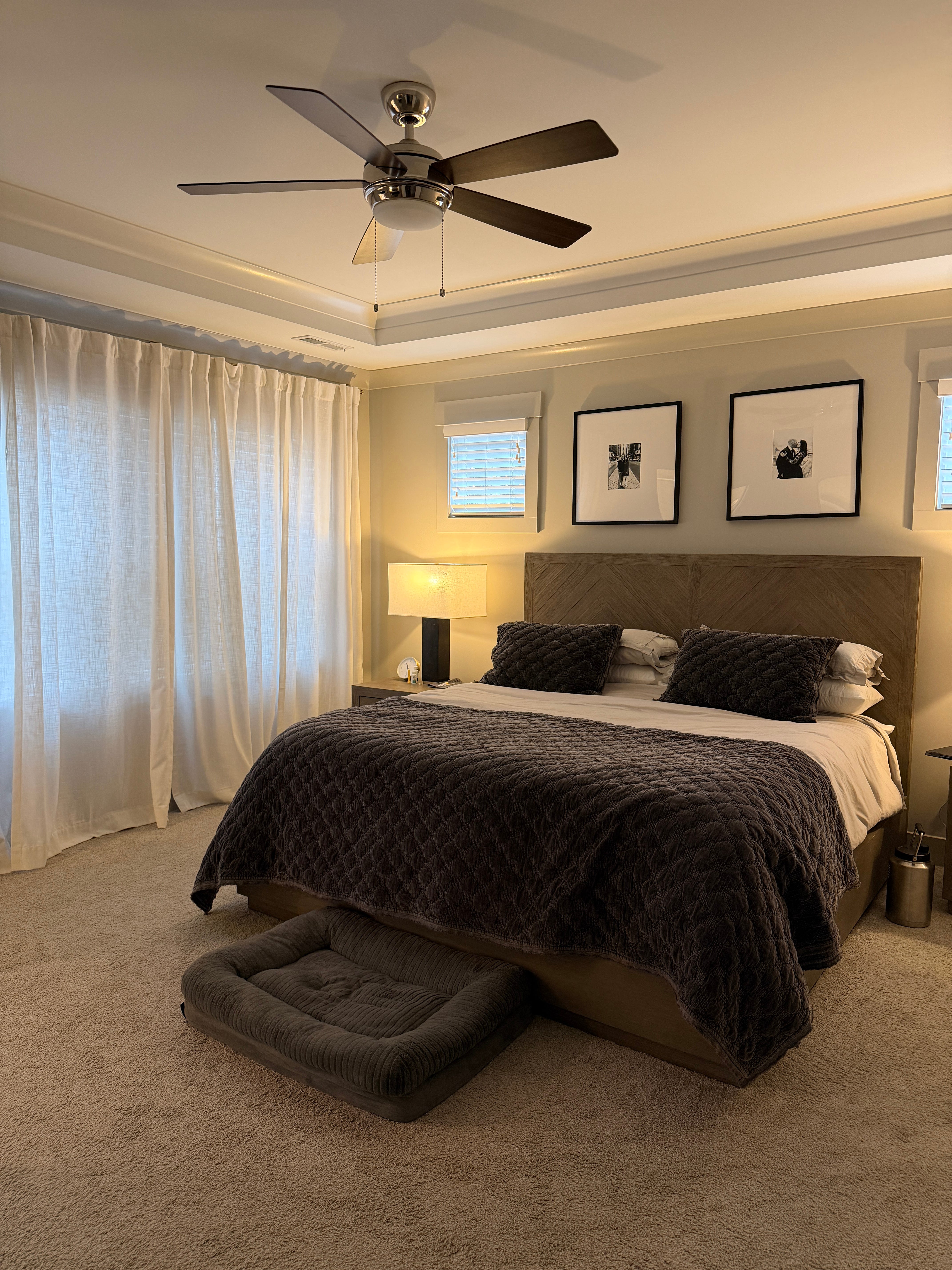 Next up was the bedroom. There wasn’t anything wrong with it, aside from the fact that I royally screwed up a wall when touching things up. So, while fixing that, we decided to do a little extra. We lightened the color of the room and did a modified color wash. We painted the trim and doors the same color as the walls, and decided to leave the ceiling tray white to help keep the room feeling “tall.”