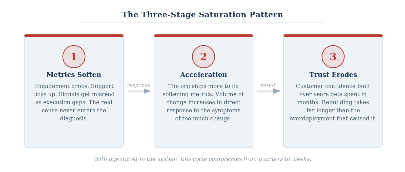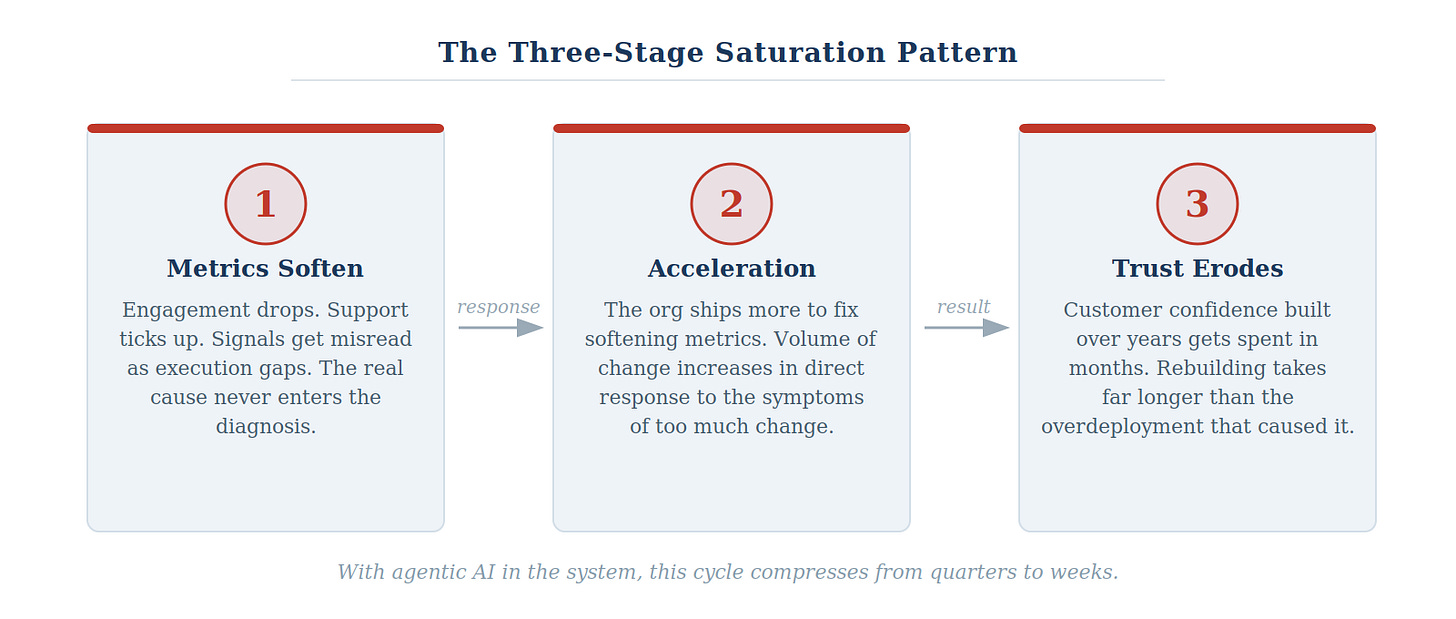 Second, the organization accelerates in response. Because the metrics softened, there is pressure to ship the next thing. Surely the next feature, the next product, the next release will turn the curve. The volume of change goes up in direct response to the symptoms of too much change. This is the pattern that turns a manageable problem into a structural one.