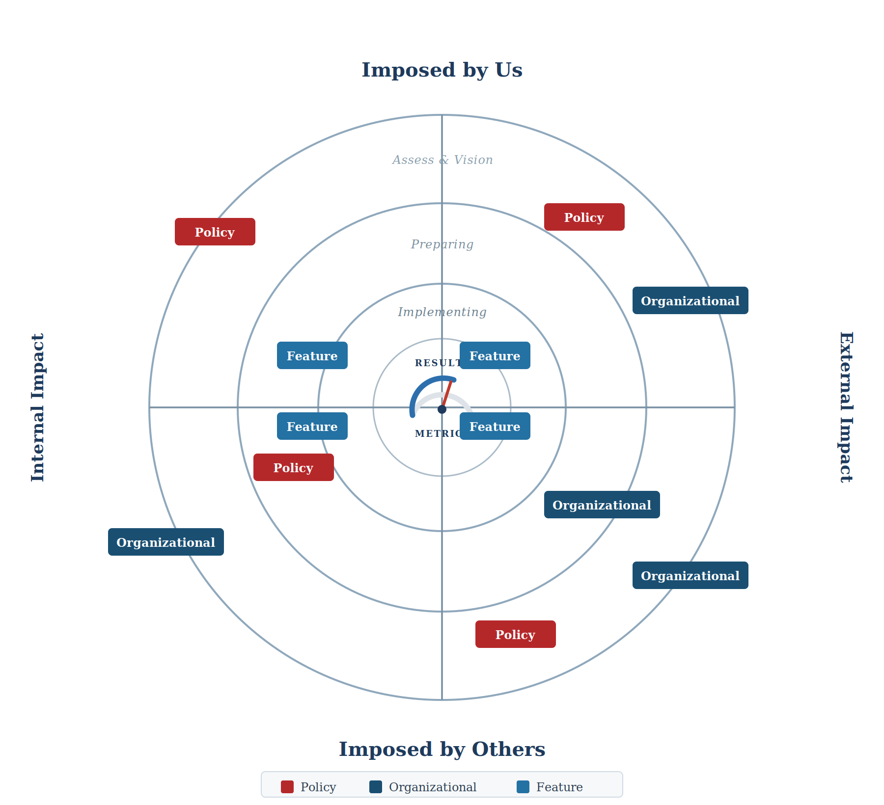 The change radar organizes all change across two axes. The first is origin: who is driving the change? Some of it we are imposing — new products, new platforms, restructured experiences. Some is being imposed on us — regulatory shifts, competitive moves, market pressure. Both consume organizational and customer capacity, and most change management frameworks only account for the first. The second axis is impact: does this change land on our internal organization, our people and processes, or on our external customers and market?