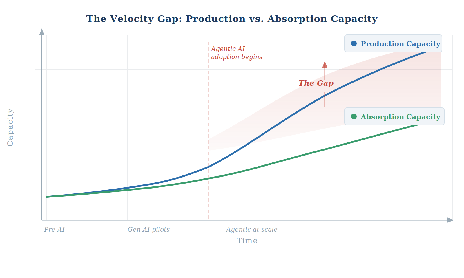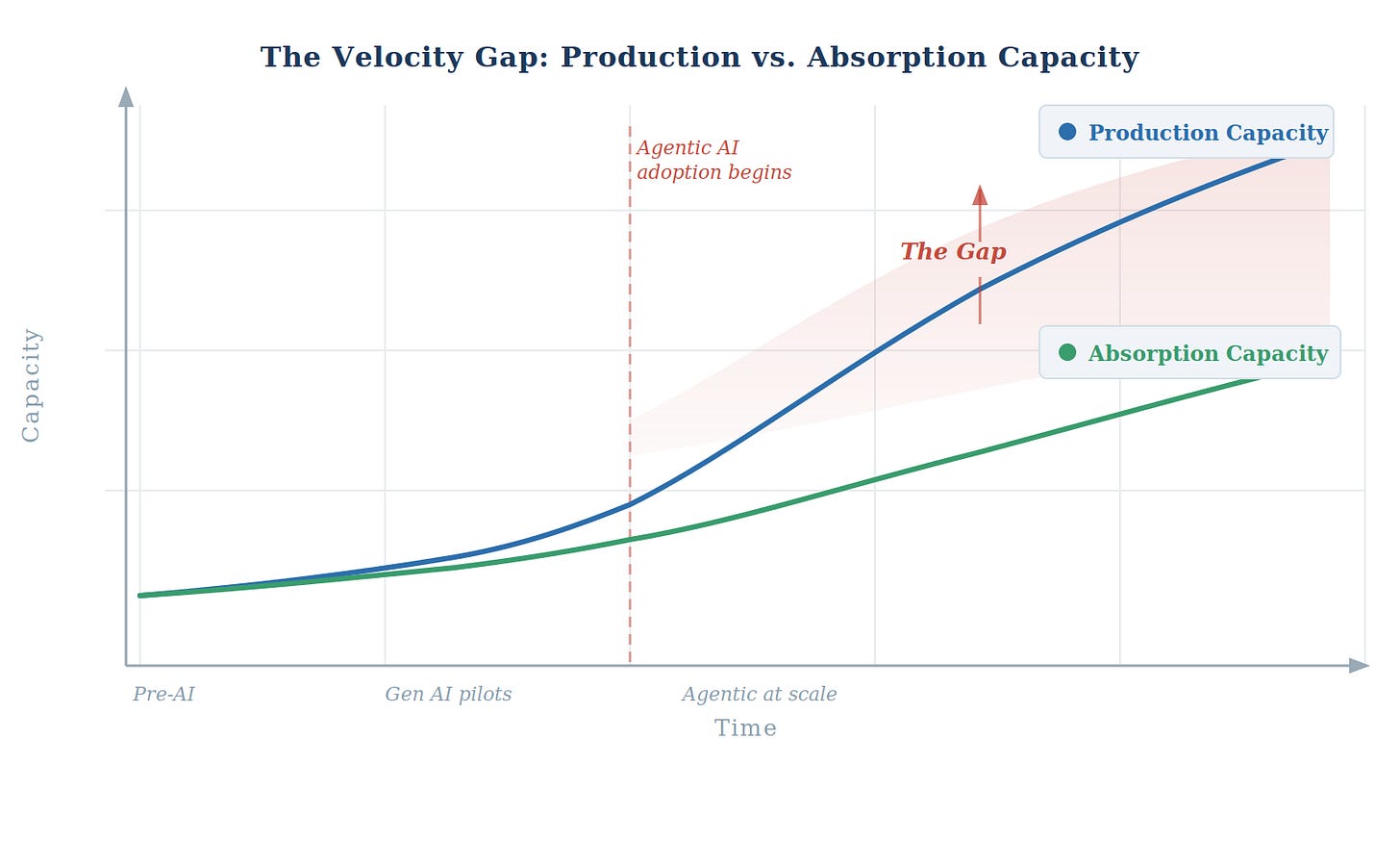 Production is climbing. Absorption is not keeping pace. That is the gap, and most organizations are not measuring it because they have never had to. The natural brakes of the previous era gave the system time to absorb what was being deployed. Those brakes are gone. What replaced them is a question most enterprises have not yet asked — until the returns fail to materialize.