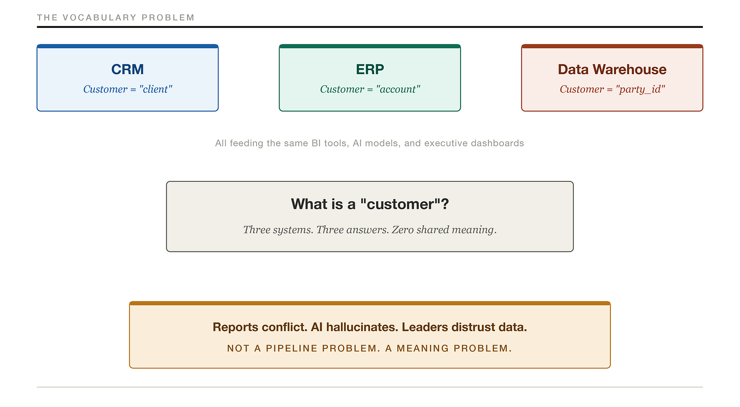 Your CRM calls them clients. Your ERP calls them accounts. Your data warehouse references them by a party identifier that means nothing to any human being who hasn’t memorized a data dictionary. When your AI model, your BI dashboard, or your executive report pulls data, it is drawing from at least three different definitions of the same concept. The downstream result is what you saw in that meeting: three numbers, zero trust.