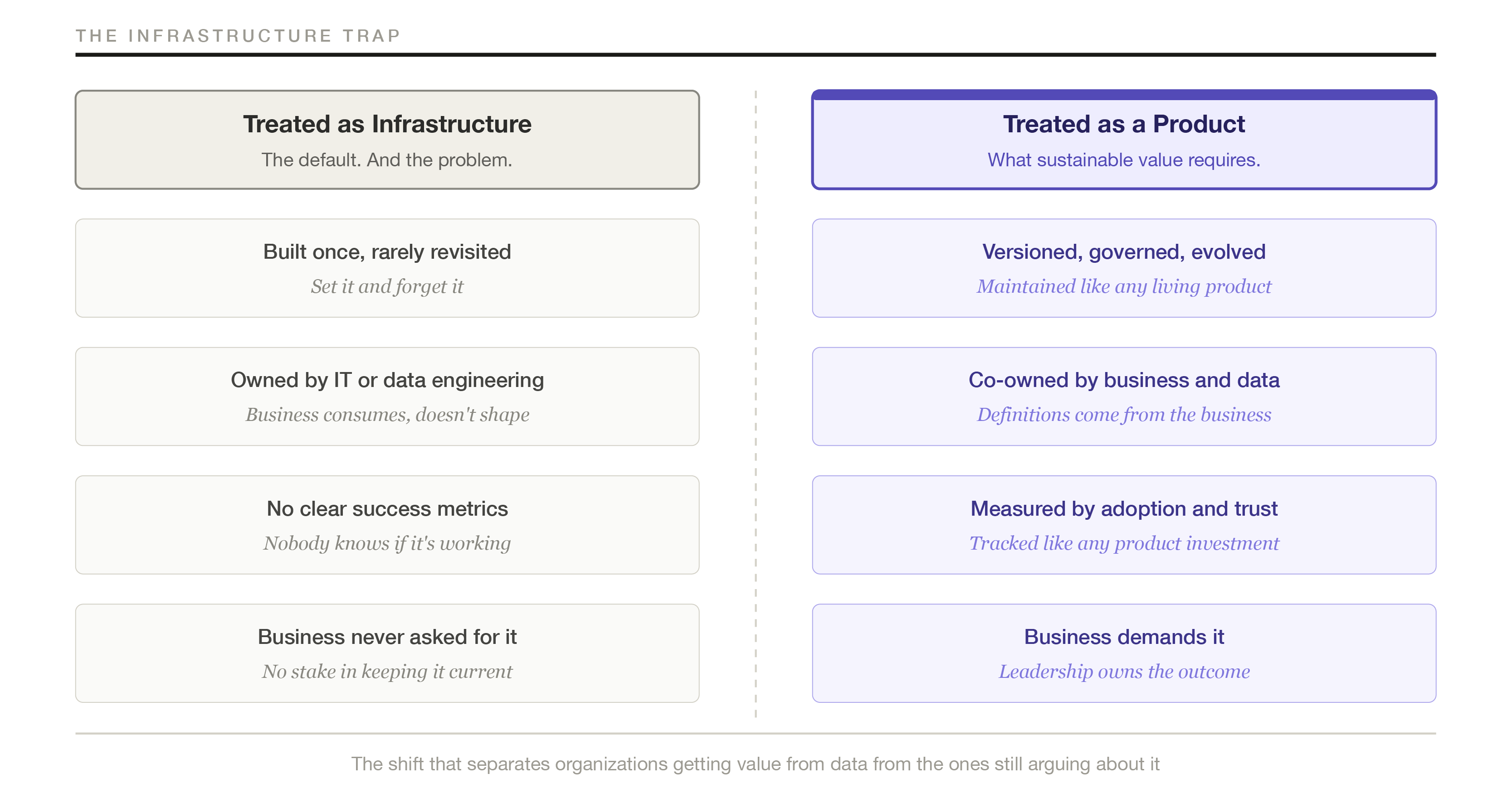 Most organizations that do invest in a semantic layer make a consistent mistake: they treat it as infrastructure rather than as a product. The distinction is not a small one. It has concrete operational consequences.