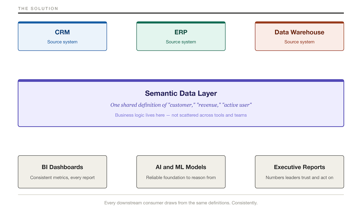 The diagram above illustrates the vocabulary problem. More pipelines won’t fix it. Faster pipelines won’t fix it. A shared dictionary that the systems are required to honor fixes it, and that is what a semantic layer does.